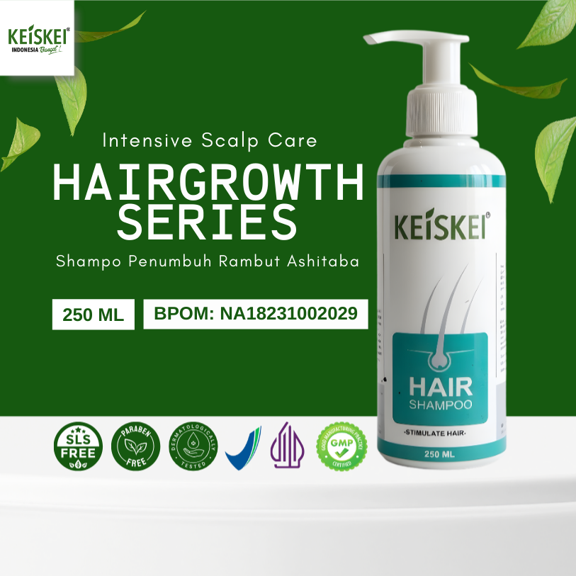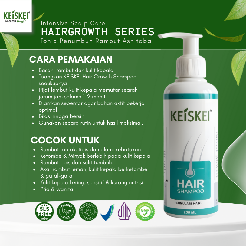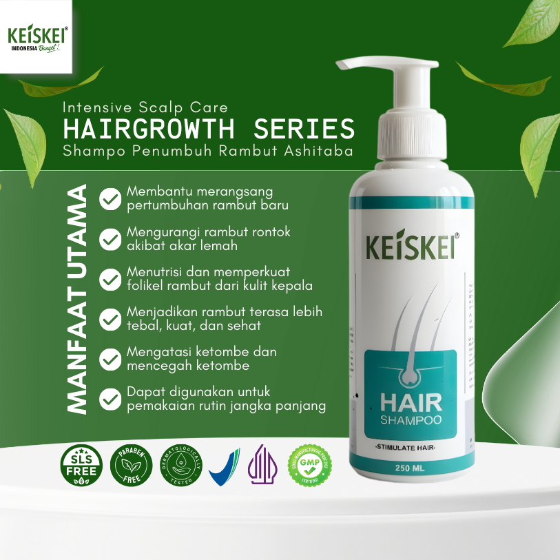 KEISKEI Hair Shampoo membantu menghentikan kerontokan, menstimulasi pertumbuhan rambut baru, dan menyehatkan kulit kepala dalam satu produk.