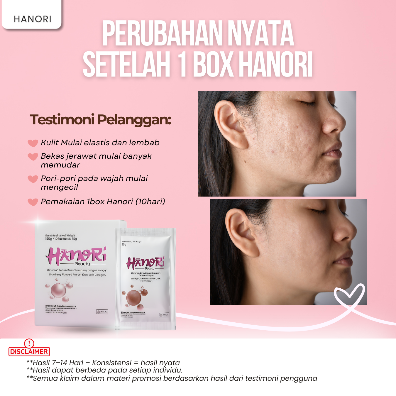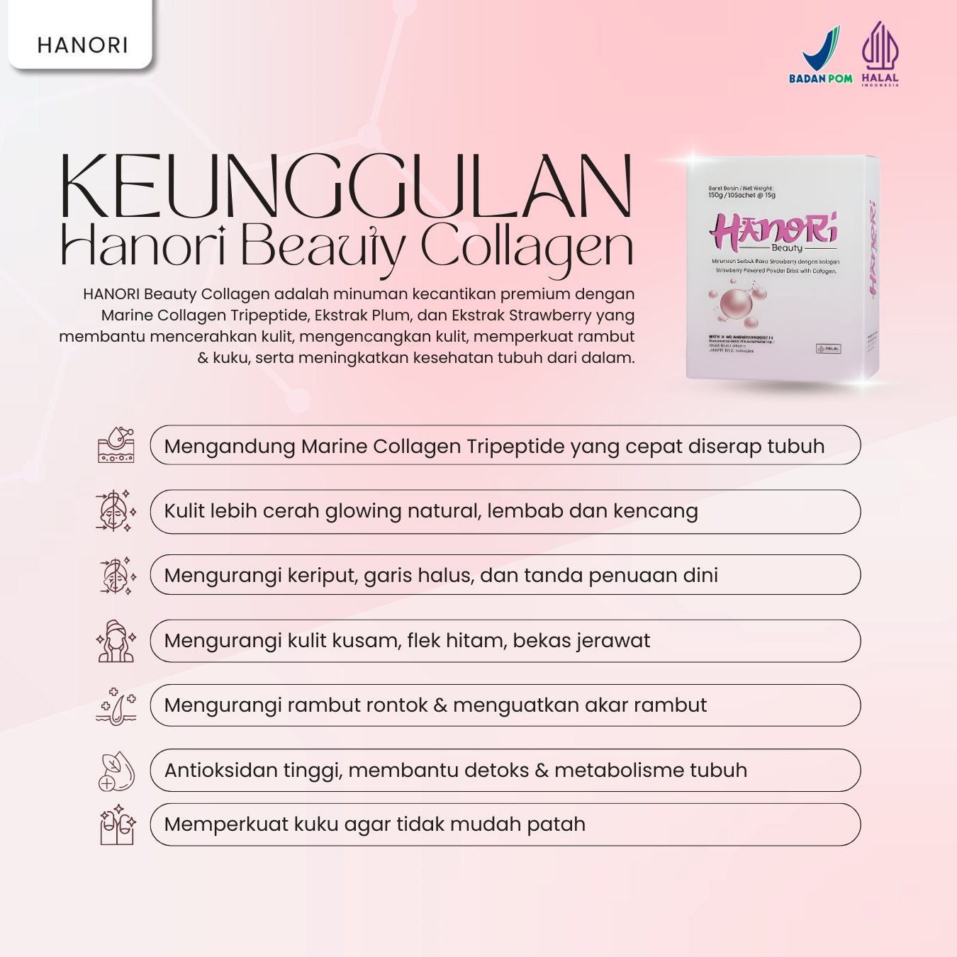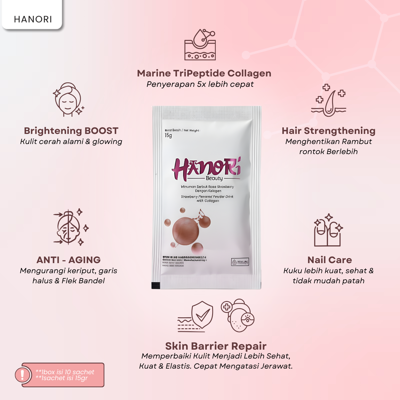 HANORI BEAUTY adalah minuman kecantikan premium berbasis Marine Collagen Tripeptide yang diformulasikan khusus untuk mencerahkan kulit, mengurangi jerawat dan bekasnya, memudarkan flek, mengatasi wajah kusam, serta menjaga kesehatan rambut, kuku, dan tubuh dari dalam.