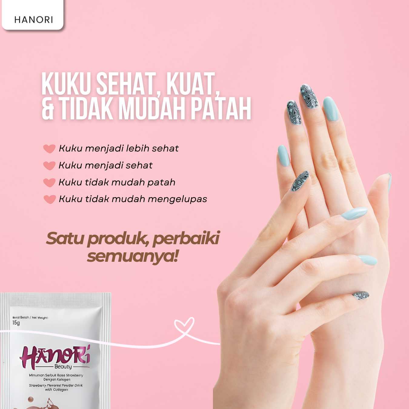 - Larutkan 1 sachet HANORI BEAUTY ke dalam 150–200 ml air dingin atau suhu ruang