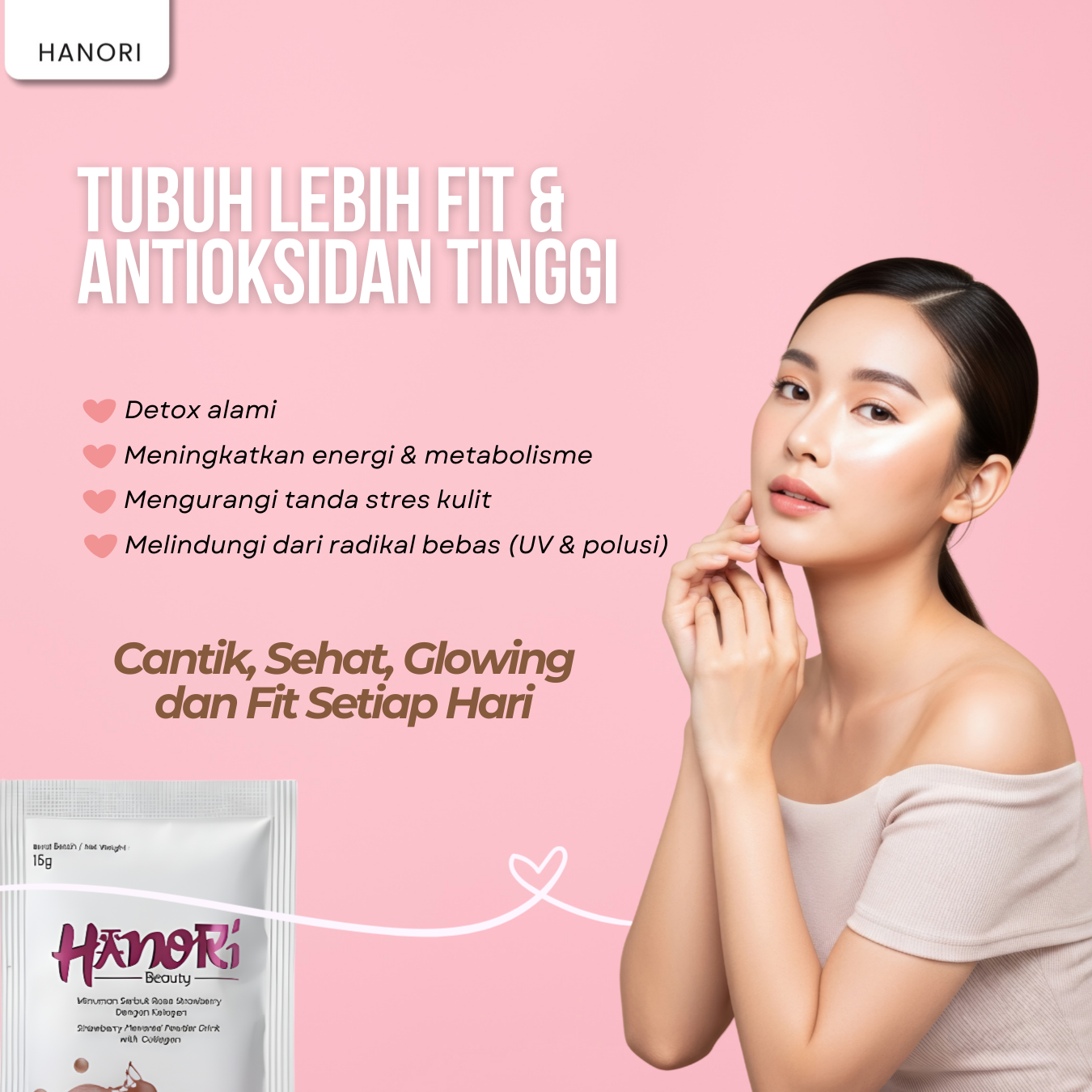 Dengan kombinasi Ekstrak Buah Plum dan Ekstrak Strawberry yang kaya antioksidan, HANORI BEAUTY bekerja lebih cepat diserap tubuh, membantu proses regenerasi kulit, memperbaiki skin barrier, dan memberikan efek glowing alami tanpa bergantung pada skincare saja.