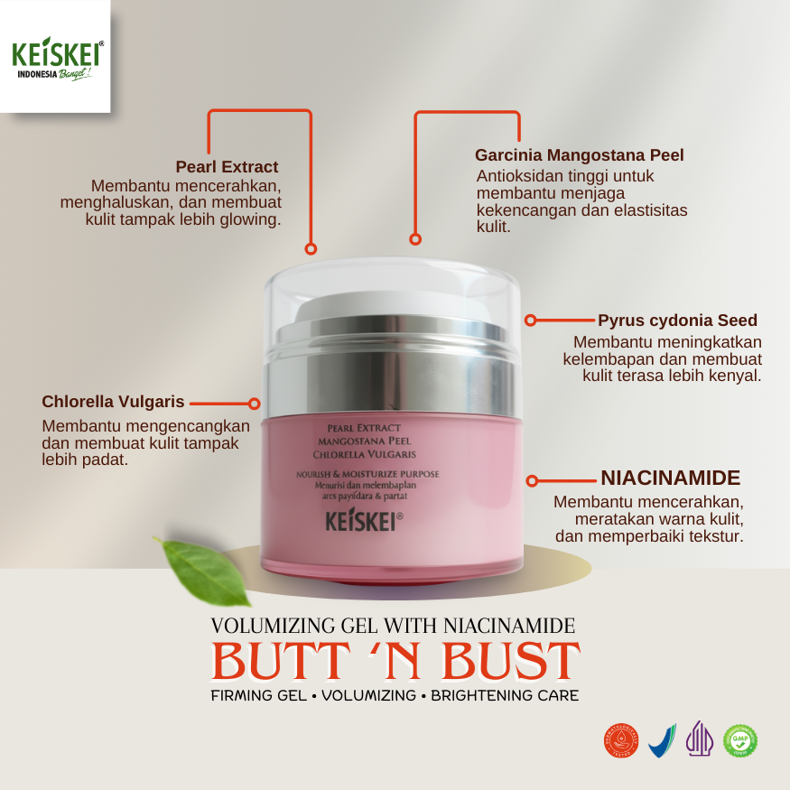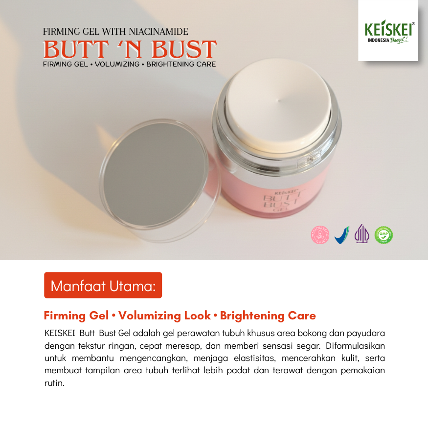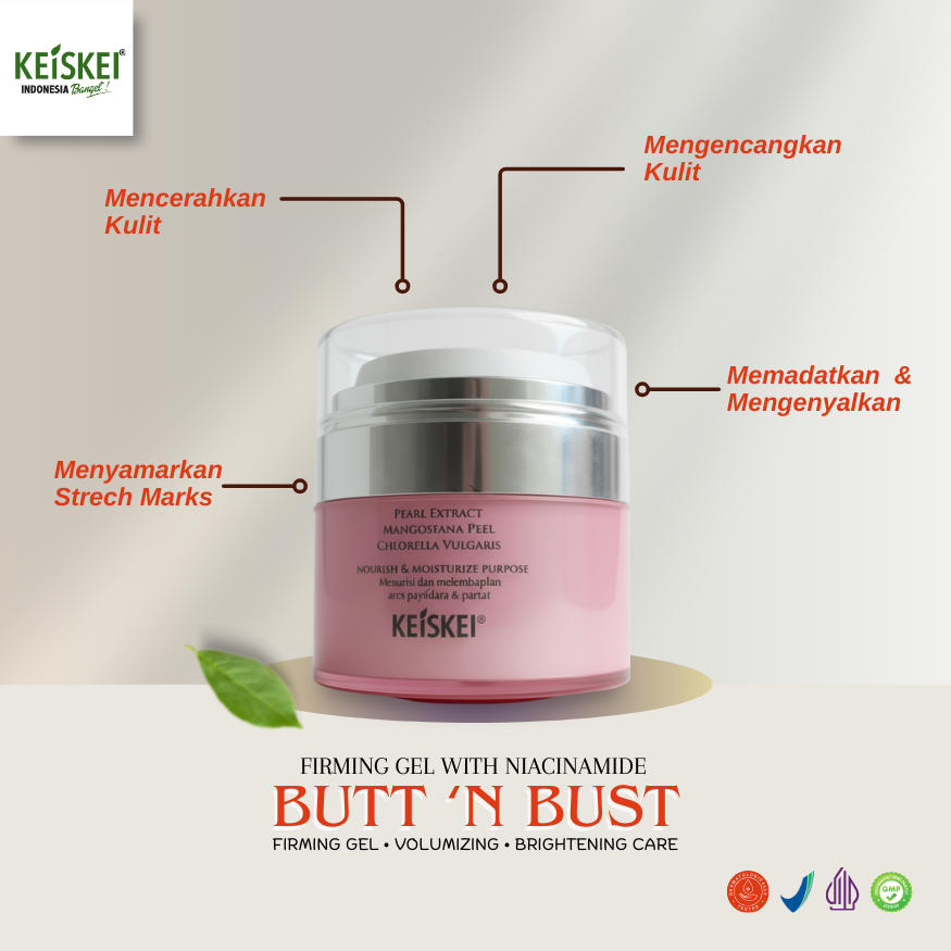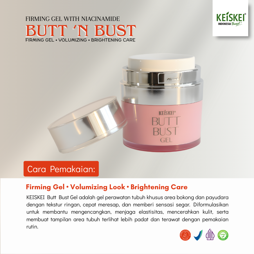 BUTT N BUST GEL diformulasikan dengan kombinasi bahan aktif premium yang bekerja sinergis untuk membantu meningkatkan elastisitas kulit, menjaga firmness, serta memberikan efek tampilan lebih berisi dan terangkat pada area payudara dan bokong. Digunakan secara rutin, kulit terasa lebih lembap, halus, dan terlihat lebih proporsional.