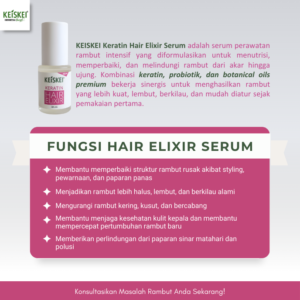 Keiskei Paket Keratin Basic Care adalah paket perawatan rambut harian dan mingguan yang dirancang khusus untuk membantu memperbaiki rambut rusak, kering, bercabang, kusam, dan sulit diatur. Kombinasi Hair Elixir Serum sebagai perawatan harian dan Keratin Hair Mask sebagai treatment intensif memberikan hasil rambut lebih kuat, lembut, halus, dan berkilau sehat dengan pemakaian rutin.