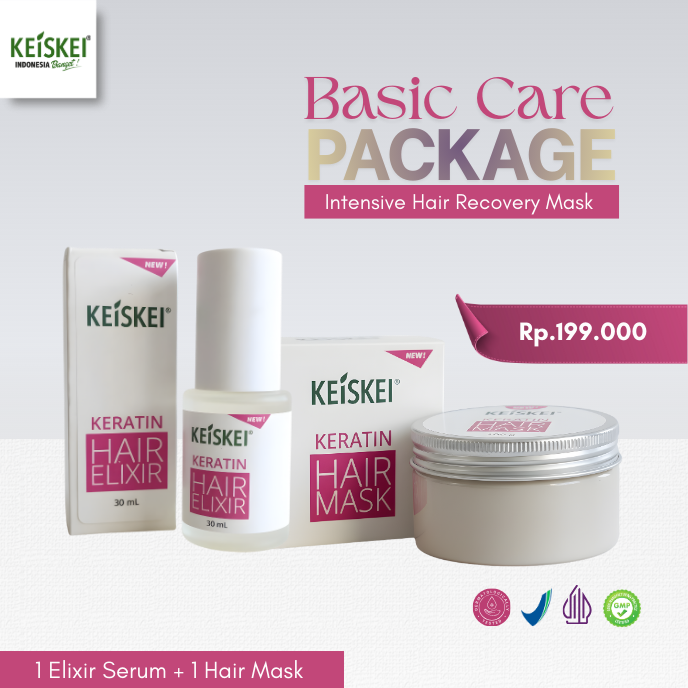 Keiskei Paket Keratin Basic Care adalah paket perawatan rambut harian dan mingguan yang dirancang khusus untuk membantu memperbaiki rambut rusak, kering, bercabang, kusam, dan sulit diatur. Kombinasi Hair Elixir Serum sebagai perawatan harian dan Keratin Hair Mask sebagai treatment intensif memberikan hasil rambut lebih kuat, lembut, halus, dan berkilau sehat dengan pemakaian rutin.