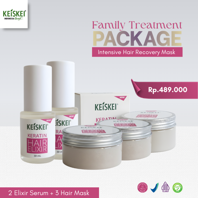 Keiskei Paket Keratin Family Treatment adalah paket perawatan rambut super lengkap dan ekonomis yang dirancang untuk penggunaan bersama seluruh anggota keluarga. Kombinasi Hair Elixir Serum untuk perawatan harian dan Hair Mask sebagai treatment intensif membantu menjaga rambut tetap kuat, lembut, sehat, dan berkilau, bahkan dengan pemakaian rutin oleh lebih dari satu orang.