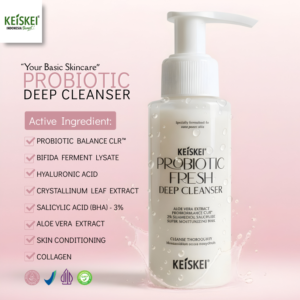 KEISKEI Probiotic Deep Cleanser adalah basic skincare wajib untuk kulit berjerawat dan acne-prone yang diformulasikan dengan Probiotic Balance CLR™ dan Salicylic Acid (BHA) 3%. Bekerja efektif membersihkan pori-pori secara mendalam, membantu mengangkat minyak berlebih, kotoran, debu, dan sel kulit mati tanpa membuat kulit kering atau terasa ketat. Non-comedogenic, ringan, dan nyaman digunakan setiap hari.