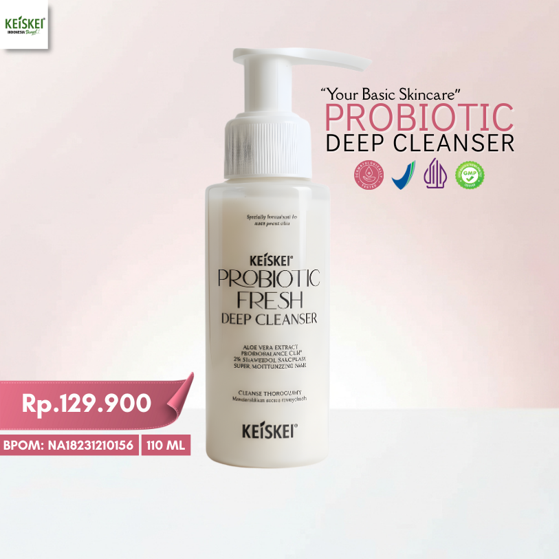 KEISKEI Probiotic Deep Cleanser adalah basic skincare wajib untuk kulit berjerawat dan acne-prone yang diformulasikan dengan Probiotic Balance CLR™ dan Salicylic Acid (BHA) 3%. Bekerja efektif membersihkan pori-pori secara mendalam, membantu mengangkat minyak berlebih, kotoran, debu, dan sel kulit mati tanpa membuat kulit kering atau terasa ketat. Non-comedogenic, ringan, dan nyaman digunakan setiap hari.