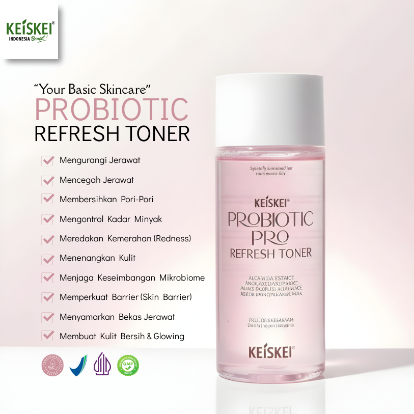 KEISKEI Probiotic Refresh Toner adalah basic skincare wajib setelah cuci muka yang diformulasikan khusus untuk kulit berjerawat dan acne-prone. Mengandung Probiotic Balance CLR™, Salicylic Acid (BHA) 3%, dan Bifida Ferment Lysate, toner ini membantu membersihkan sisa kotoran di pori-pori, mengontrol minyak berlebih, sekaligus menyegarkan dan menenangkan kulit tanpa rasa perih atau ketat. Teksturnya ringan, cepat meresap, dan non-comedogenic, ideal untuk pemakaian harian pagi dan malam.