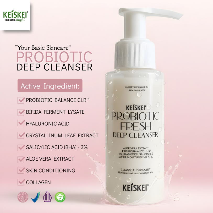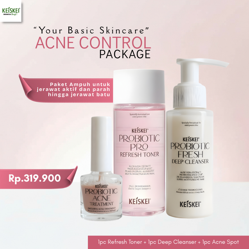 Paket KEISKEI Probiotic Acne Control adalah basic skincare lengkap yang dirancang untuk mengontrol jerawat secara menyeluruh dari tahap pembersihan hingga perawatan terfokus. Kombinasi Deep Cleanser, Refresh Toner, dan Acne Spot Treatment bekerja sinergis untuk membersihkan pori-pori, mengontrol minyak berlebih, dan merawat jerawat aktif tanpa membuat kulit terasa kering atau ketat.