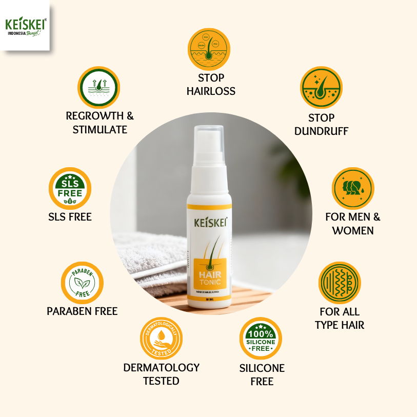 Mini Hair Tonic KEISKEI adalah hair tonic penumbuh rambut konsentrat yang diformulasikan untuk membantu menstimulasi pertumbuhan rambut (regrowth), mengurangi kerontokan, serta mengatasi ketombe dan rasa gatal pada kulit kepala. Bekerja langsung di akar rambut dan kulit kepala, hair tonic ini membantu menciptakan lingkungan optimal agar rambut tumbuh lebih kuat, lebih sehat, dan lebih tebal.